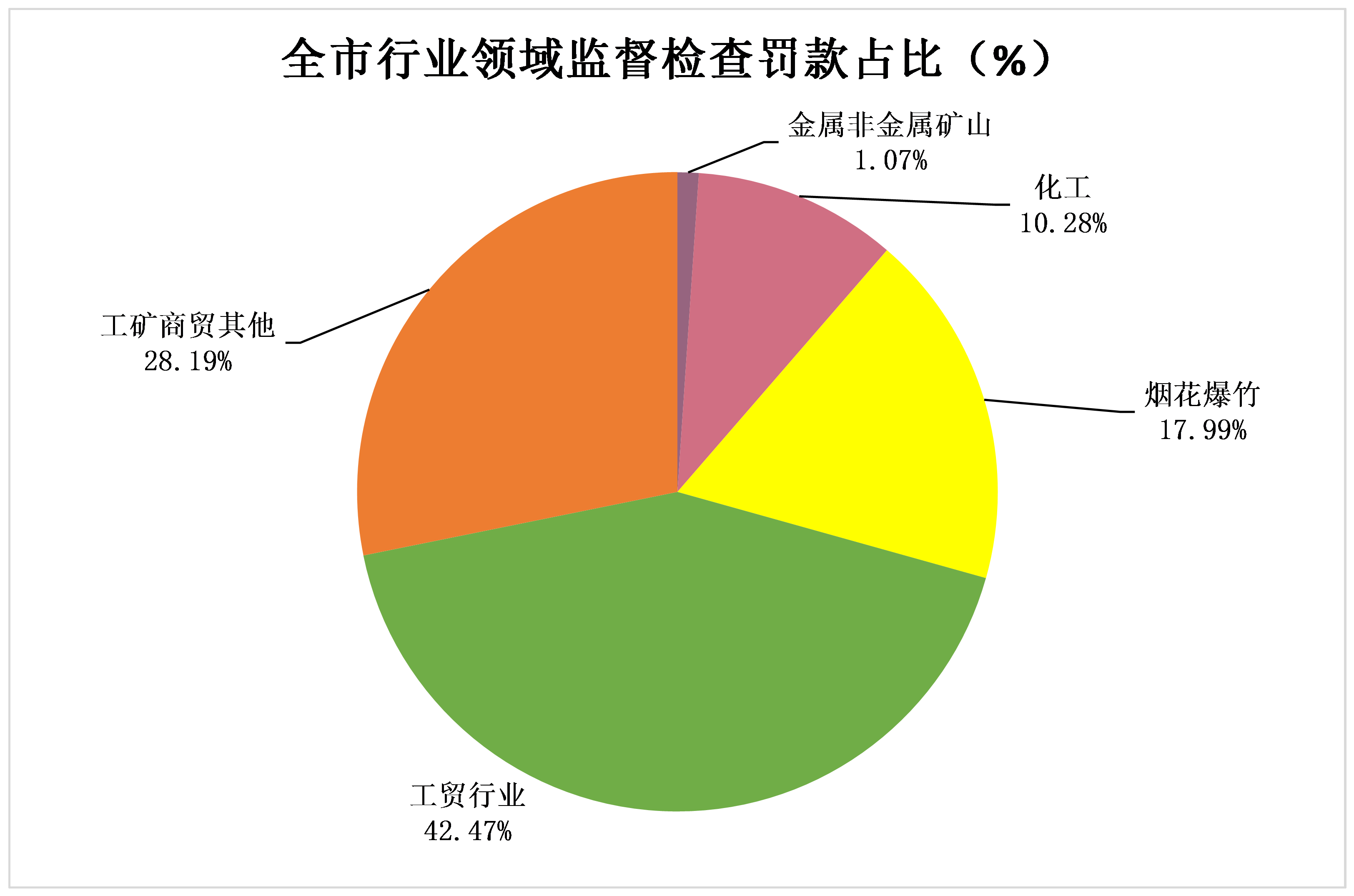 1-5月,全市應(yīng)急管理系統(tǒng)行業(yè)領(lǐng)域?qū)嵤┍O(jiān)督檢查罰款119.92萬元,其中金屬非金屬礦山1.28萬元(占比1.07%),化工12.33萬元(占比10.28%),煙花爆竹21.58萬元(占比17.99%),工貿(mào)行業(yè)50.93萬元(占比42.47%),工礦商貿(mào)其他33.80萬元(占比28.19%)。