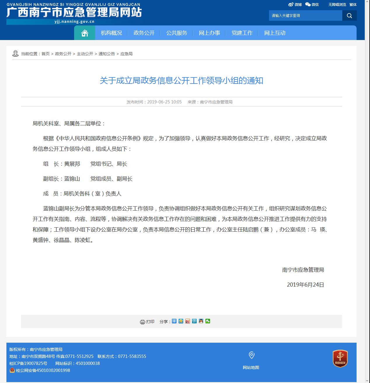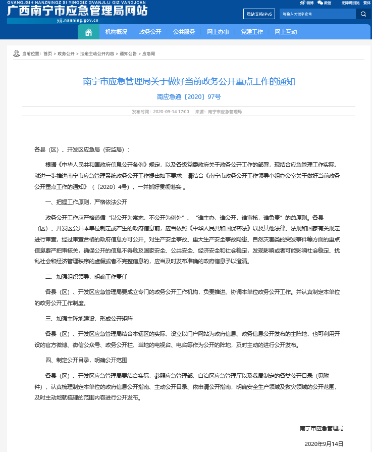 一是在本局官方網站上及時更新部門職能、機構設置以及領導信息。根據新修訂《條例》,進一步細化完善本級安全生產領域和救災領域基層政務公開標準目錄指引,按照公開的目錄指引,及時更新公開內容信息,不斷推進本局政務公開規范化標準化,增強了公開實效,成為助力保安全、護穩定、惠民生的良好推動力。二是積極推進應急管理基層政務公開工作。按照《南寧市全面推進基層政務公開標準化規范化工作實施方案》要求,扎實推進全市應急管理系統基層政務公開工作,印發推進基層政務公開工作指導意見,舉辦推進基層政務公開工作視頻培訓講座。指導全市15個縣區、開發區應急管理部門(安全生產監督管理部門)制定政務公開指南和公開目錄,至2020年11月底所有縣區應急管理局已全部完成了本級政務公開目錄的公開發布工作。