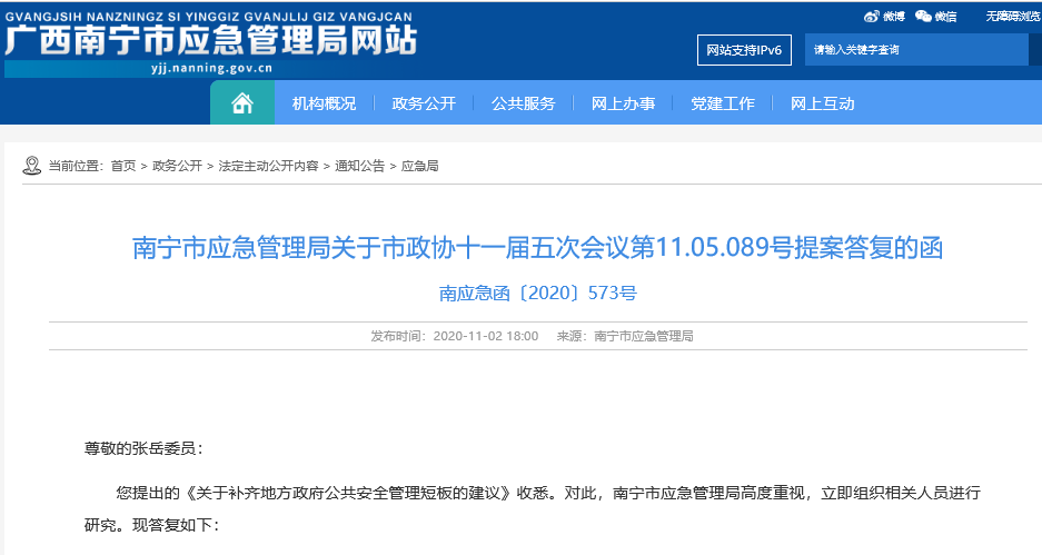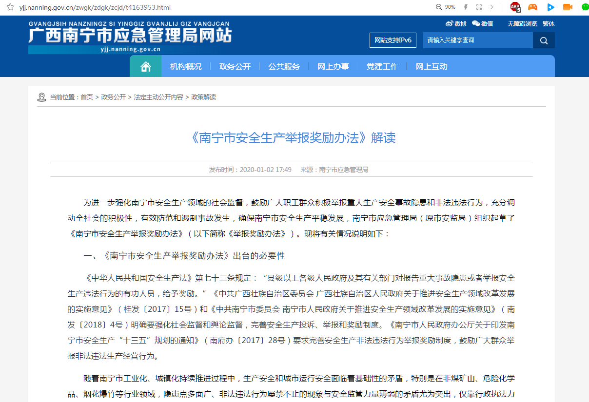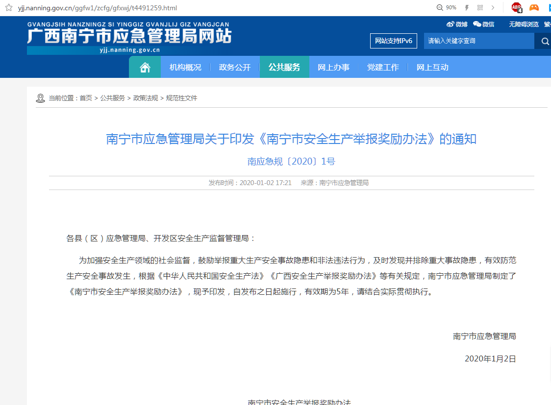 在市應急局網站公布政策文件—《南寧市安全生產舉報獎勵辦法》