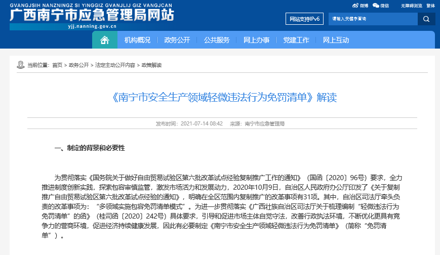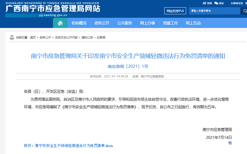 在市應急局網站公布政策文件—《南寧市安全生產領域輕微違法行為免罰清單》
