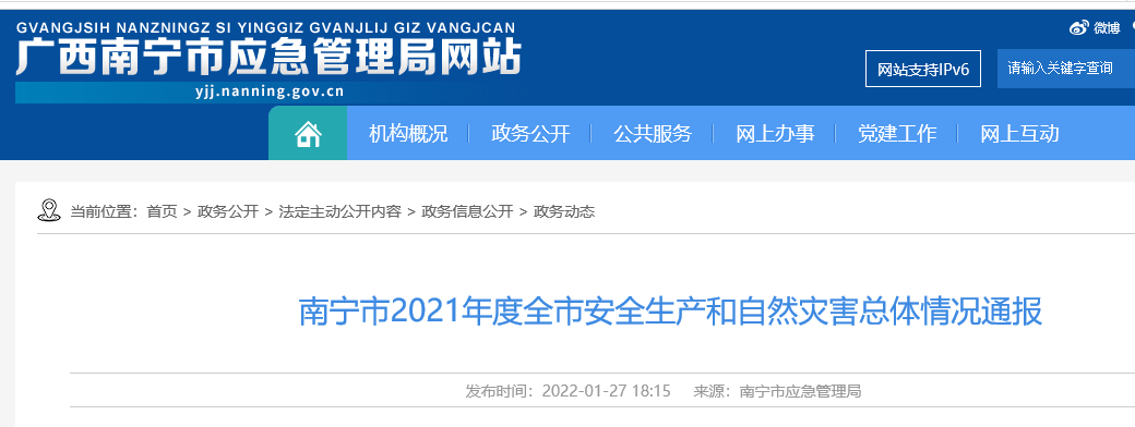 ????本年度報告是根據《中華人民共和國政府信息公開條例》(中華人民共和國國務院令第711號,以下簡稱《條例》)規定,由南寧市應急管理局編制。報告全文包括南寧市應急管理局2021年度政府信息公開工作總體情況、主動公開政府信息的情況、收到和處理政府信息公開申請情況、政府信息公開行政復議、行政訴訟情況、存在的主要問題及改進情況以及其他需要報告的事項六個部分。本年度報告中所列數據統計期限自2021年1月1日起至12月31日止。本年度報告在南寧市應急管理局門戶網站(http://www.oqsbrzt.cn)和南寧市政務服務中心、檔案館、公共圖書館等途徑全文公開。對本年度報告如有任何疑問,請與南寧市應急管理局政府信息公開工作領導小組辦公室聯系(地址:南寧市雙擁路48號,郵編:530022;電話:0771-5530733,電子郵箱:nnyjglj@163.com)。